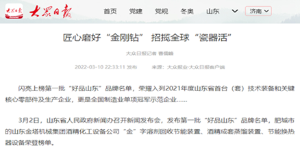 榮耀閃閃,品牌彰顯。 近日,2022年山東省優(yōu)質(zhì)品牌榜單揭曉。山東金塔機(jī)械集團(tuán)“廢液蒸發(fā)成套裝備”、“用于熱敏性物料的蒸發(fā)裝置”榮耀上榜。至此,自2019年榜單發(fā)布以來,金塔集團(tuán)共有10項(xiàng)產(chǎn)品榮獲山東優(yōu)質(zhì)品牌稱號(hào)。 山東金塔集團(tuán)守正創(chuàng)新強(qiáng)主業(yè),精耕細(xì)作鑄品牌,突出以科技創(chuàng)新強(qiáng)化品牌支撐,年年出成果,歲歲有專利,新工藝、新技術(shù)、新產(chǎn)品拓寬了市場新領(lǐng)域。作為《酒精蒸餾塔》、《糠醛水解鍋》、《糠醛蒸餾塔》等20余項(xiàng)國家行業(yè)標(biāo)準(zhǔn)的制定者,金塔集團(tuán)聚焦雙碳目標(biāo),把控綠色節(jié)能方向,牢牢占據(jù)行業(yè)制高點(diǎn),贏得了市場話語權(quán)。通過深入實(shí)施品牌戰(zhàn)略,致力打造自主品牌,金塔產(chǎn)品質(zhì)量優(yōu)、品質(zhì)好、標(biāo)準(zhǔn)化的綜合優(yōu)勢得到全方位厚植。 金塔品牌靚,展示好形象。“金”字及圖商標(biāo),中國馳名商標(biāo);首批“好品山東”,金塔榮耀其中;山東優(yōu)質(zhì)品牌,連年完美上榜…金塔在出新中更加出彩,品牌在打造中愈加閃亮。 品牌閃爍,金塔增色。以品牌樹形象,以品牌闖市場,金塔品牌之路越走越寬廣,為助推企業(yè)高質(zhì)量發(fā)展注入了強(qiáng)大動(dòng)能。
